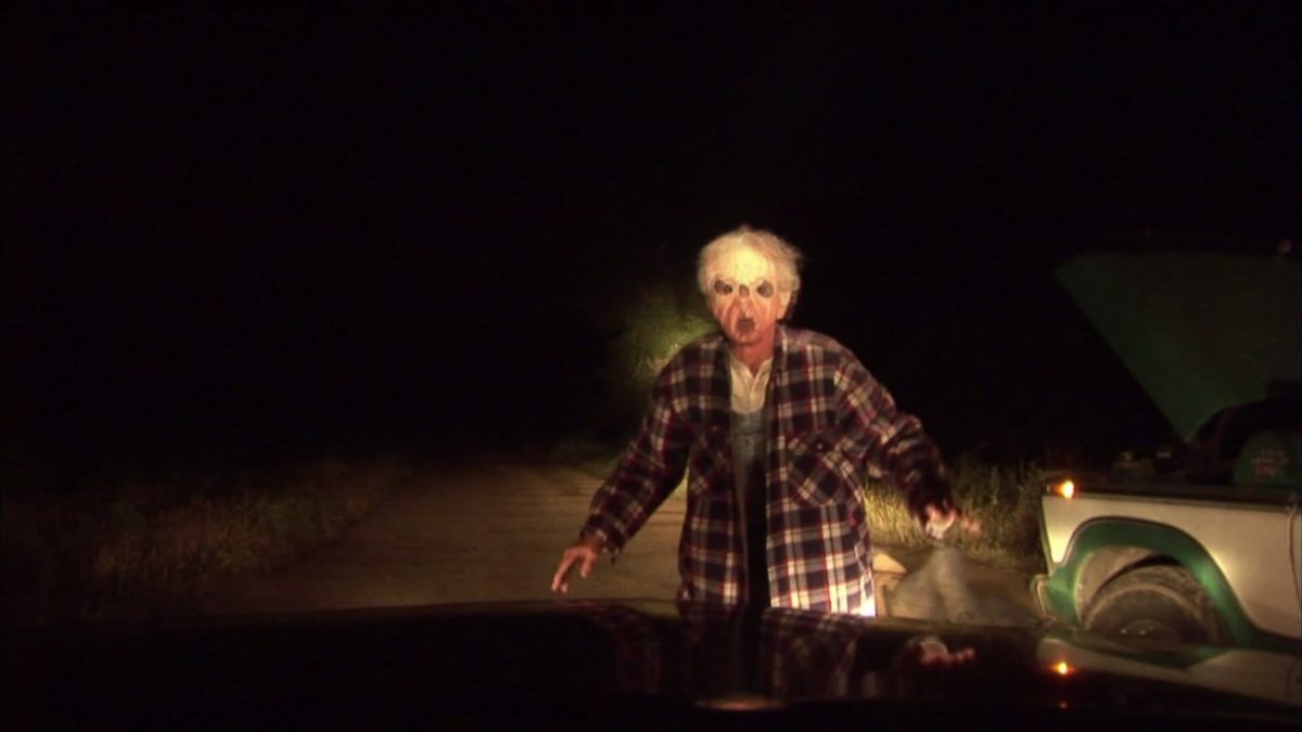 Unfortunately, as Cheryl drives one way, she encounters a roadblock and her infected boyfriend, upon turning around and driving the opposite direction, she encounters an infected farmer blocking her path. This film contains a good deal of back-and-forth driving through the park.